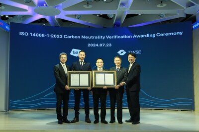 Taiwan Stock Exchange has become the first exchange in the Asia-Pacific region to receive the ISO 14068-1 carbon neutrality verification issued by BSI. From left to right: Peter Pu, Managing Director of BSI NE Asia Region, Harold Pradal, President of Assurance Services and Executive Committee Member of BSI Group, Sherman Lin, Chairman & CEO of the TWSE, Hsiu-Sheng Tsai, Senior Vice President of Administration Department of the TWSE, and Joshua Tien, CEO of Taiwan Carbon Solution Exchange (TCX).
