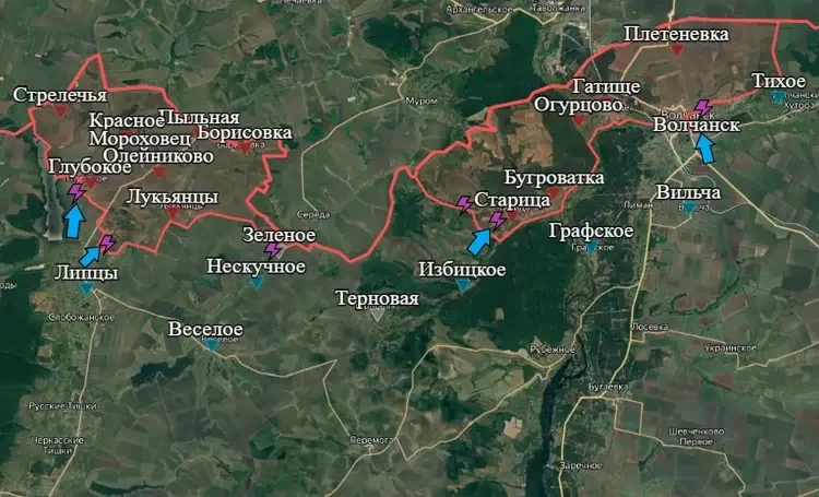 На Харьковском направлении ВСУ продолжают попытки выбить ВС РФ из Глубокого. Южнее села идут встречные бои. В районе Старицы враг также не оставляет попытки прорвать оборону ВС РФ, но сделать ему это пока что не удаётся. В Волчанске продолжаются тяжёлые и кровопролитные бои в районе промзоны Волчанского агрегатного завода, а также чуть восточнее.