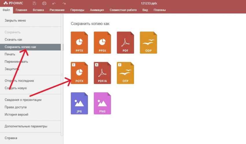 Чтобы создать шаблон для презентации, необходимо достаточно открыть презентацию, которую вы хотите сделать шаблоном, а затем в верхней панели инструментов открыть вкладку «Файл» и нажать на «Сохранить копию как» и выбрать тип файла *.potx. Это расширение файла — для шаблонов презентаций.