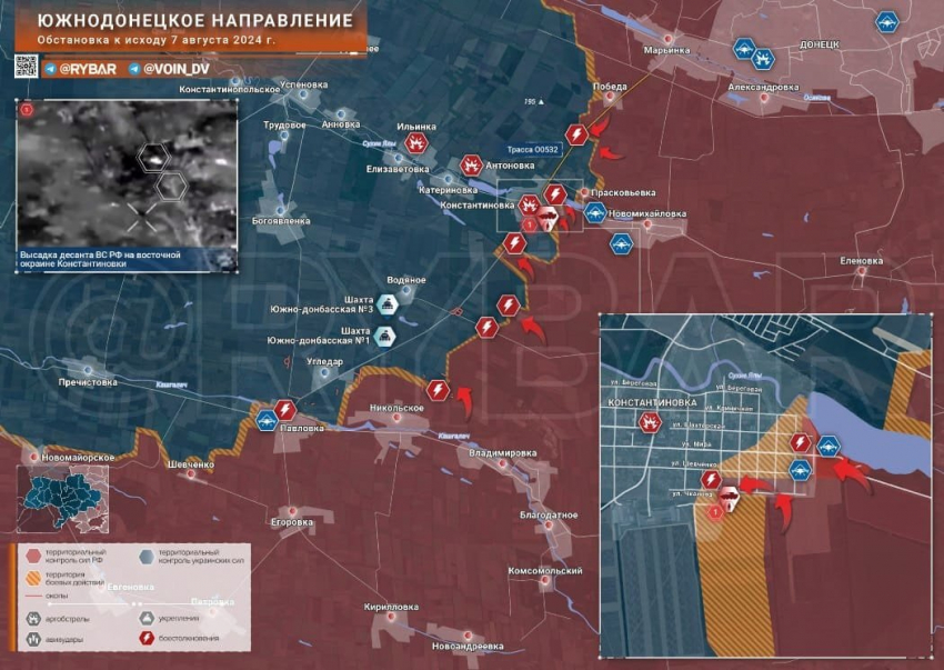 На Южнодонецком направлении российские войска закрепляются на восточной окраине Константиновки, продвигаясь вдоль пруда на север и в руинах частного сектора на запад.