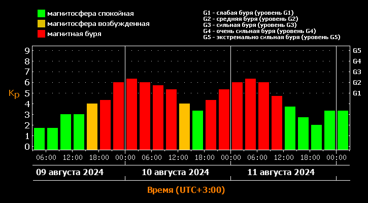 Однако уже ближе к ночи, после полуночи, ожидается увеличение класса магнитной бури до G2. Вторая магнитная буря обрушится на Землю в ночь на 11 августа.