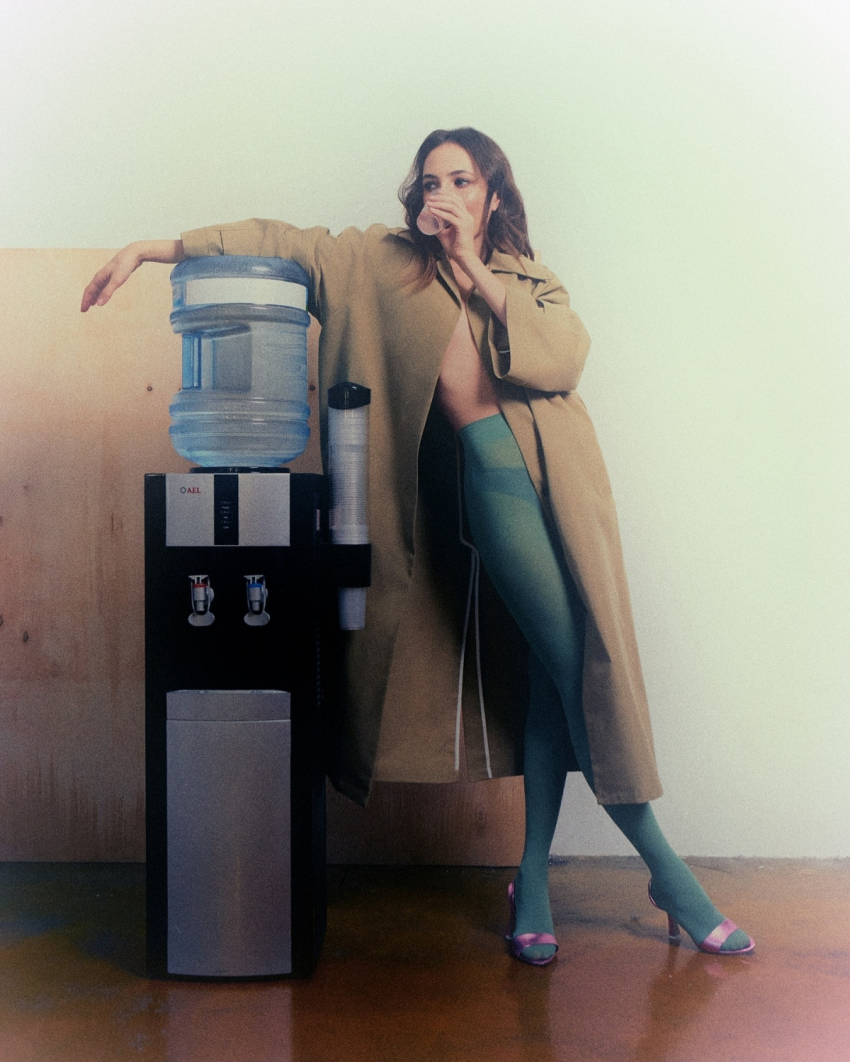 В одном из нарядов актриса сочетала бирюзовые колготки с тренчем цвета охры и лиловыми босоножками, создавая эффектный образ, напоминающий выход Бьянки Цензори.