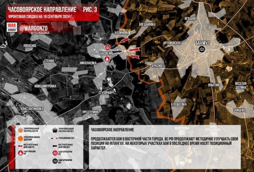 В направлении Часов Яра продолжаются бои в восточной части города. ВС РФ продолжают методично улучшать свои позиции на флангах. На некоторых участках бои в последнее время носят позиционный характер.