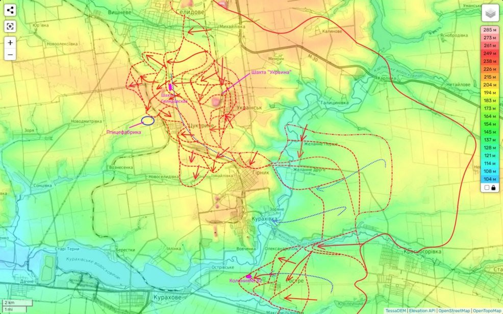 На севере от Цукуриного до трассы Селидово-Курахово нам осталось пройти 2 км. Фактически эта дорога уже не может быть противником использована для подвоза и эвакуации.