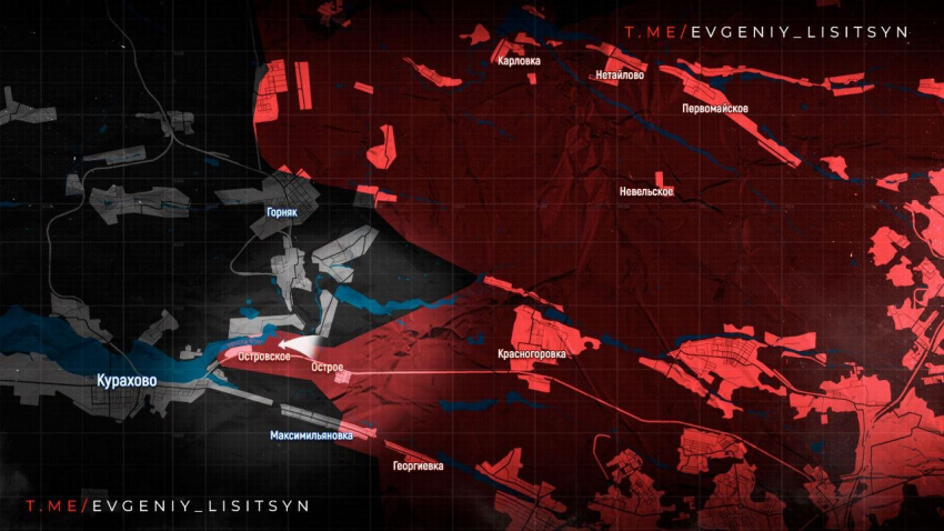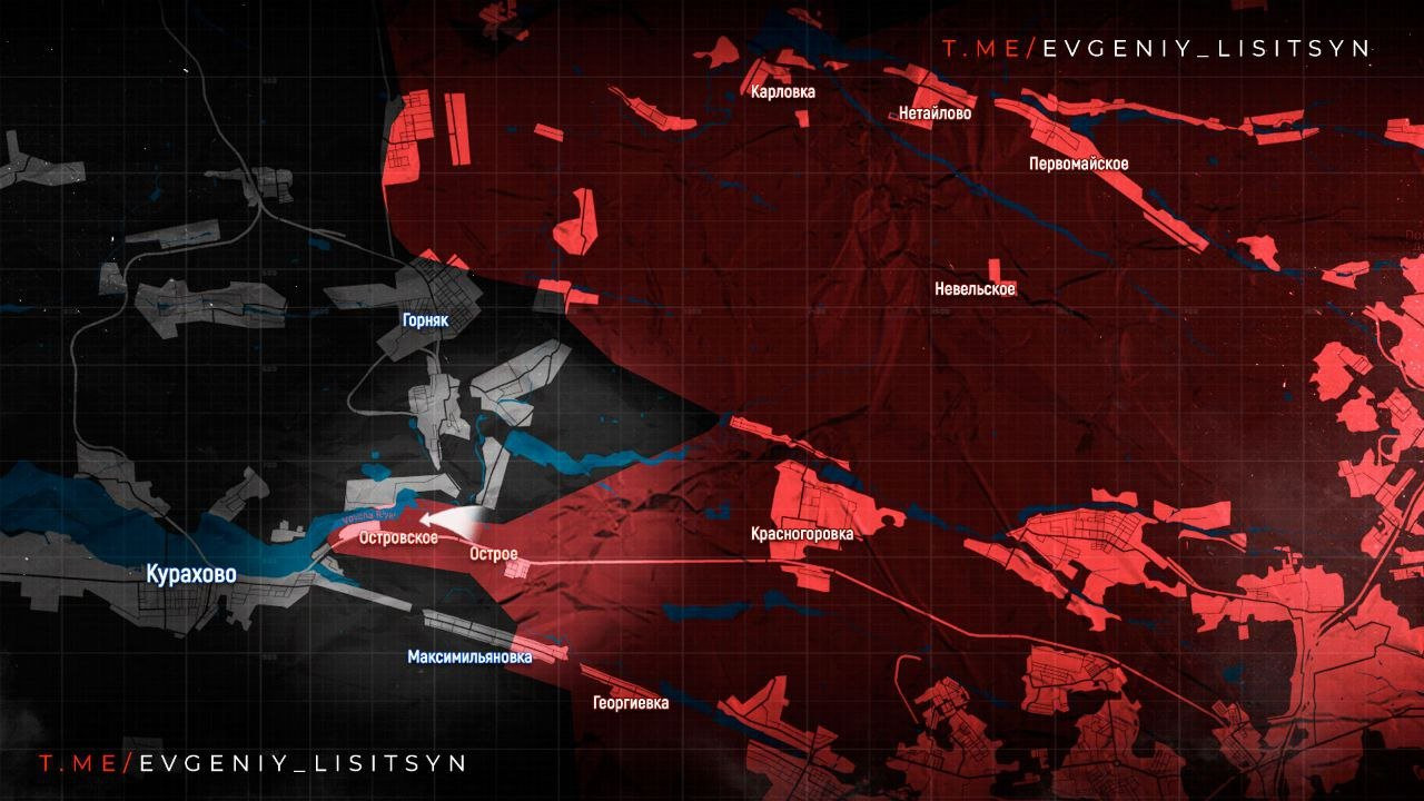 На Кураховском направлении наши парни закрепились в центре Максимильяновки. Также наши ВС РФ зашли на восточную окраине села Островское, которое вплотную прилегает с востока к Курахово, сообщает в Telegram-канале военкор Евгений Лисицын.