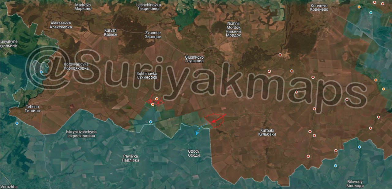В Глушковском районе отмечены боестолкновения в районе Веселого. Судя по появившимся в Сети кадрам, противнику удалось продвинуться в лесополосах к юго-востоку от села и подтянуть подразделения БЛА.