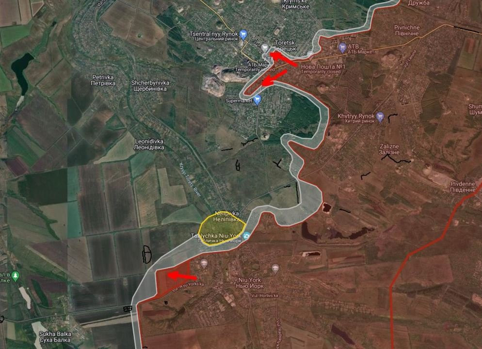 На Торецком направлении в центральной части Торецка продолжаются встречные бои, ВС РФ расширили контроль территории вдоль улицы 51-ой Армии, Европейская, Василия Стуса, Дружбы и Рудничная. Севернее Нью-Йорка российские войска продвинулись на глубину до 750 м.