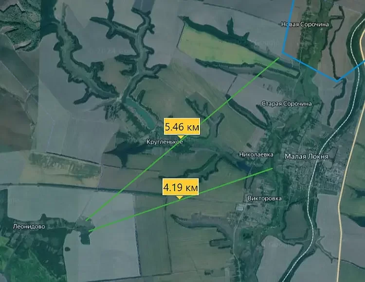 Довольно интересно выглядит обстановка на северном участке. От недавно взятого ВС РФ Леонидово до Малой Сорочины - около 5,5 км, а до Малой Локни, за которую сейчас идут бои, около 4 км. Об этом сообщает PulsePen.
