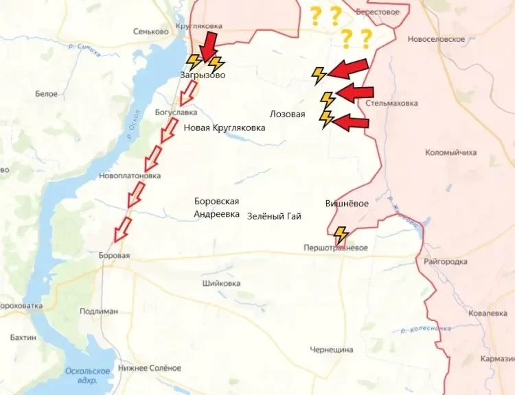Продолжаются бои на границе между Кругляковкой и Загрызово. Информации об активных штурмовых действиях ВС РФ пока что не поступало. Предположительно, на этом участке в планах ВС РФ продвижение на юг по трассе вдоль реки Оскол. На пути находятся населённые пункты Загрызово, Богуславка, Новоплатоновка и сама Боровая, являющаяся важным логистическим центром на этом участке.