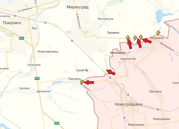 Западнее и севернее Гродовки идут бои. Наши бойцы атакуют с переменным успехом. Западнее Гродовки подразделениям ВС РФ удалось продвинуться в районе трассы Гродовка - Мирноград, сообщает PulsePen.