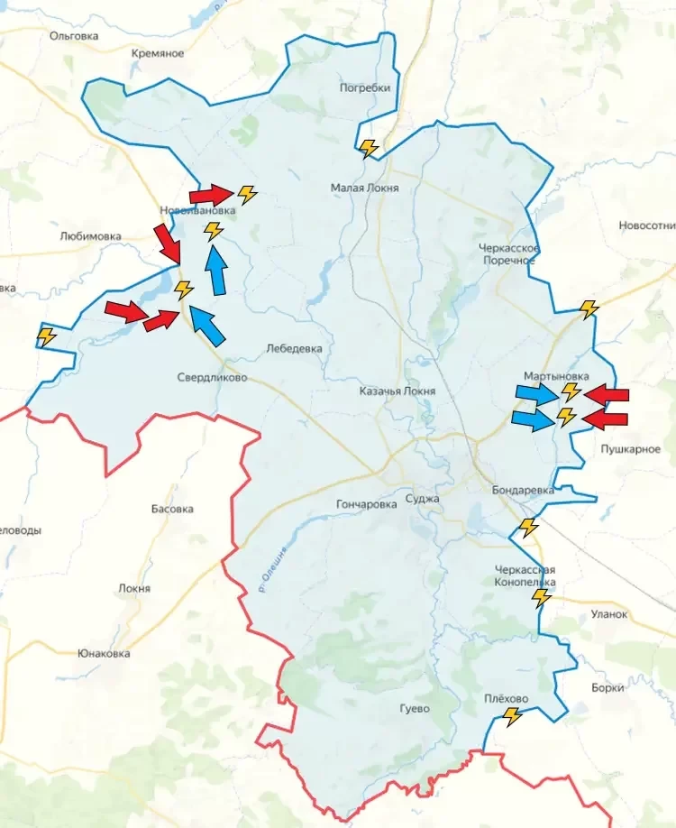 В Кореневском районе, по некоторым данным, российские войска смогли достичь дамбы через реку Снагость в районе Любимовки, сомкнув «кольцо» вокруг Толстого Луга. Однако однозначных подтверждений этого пока нет.