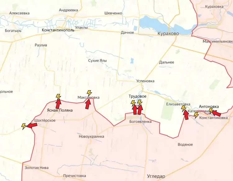 На Константинопольском направлении российские войска имеют тактические успехи северо-западнее и севернее Богоявленки, давят в направлении Трудового. С РФ ведут зачистку Максимовки. Под контроль ВС РФ перешло Шахтёрское, боестолкновения продолжаются западнее и южнее населённого пункта. В районе Золотой Нивы российские войска давят в западном и северо-западном направлениях.