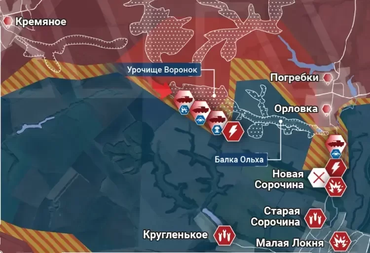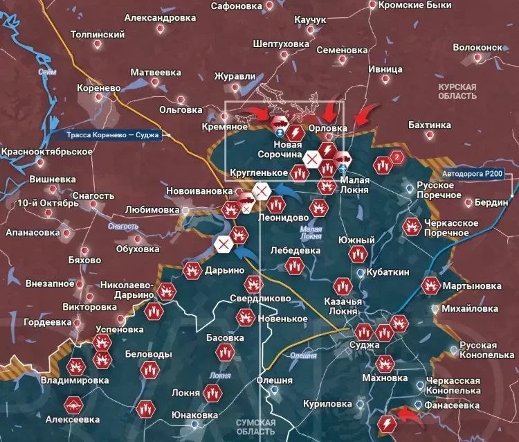 На северном участке продолжаются ожесточенные боестолкновения в границах села Новая Сорочина (южнее Погребков), где ВС РФ пытаются закрепиться под плотным огнем и массированными ударами дронов противника. После первоначального прорыва обороны дальше развить успех пока не удается. Подразделения ВС РФ провели атаку на стыке Кореневского и Суджанского районов к востоку от Кремяного в направлении Новой Сорочины.