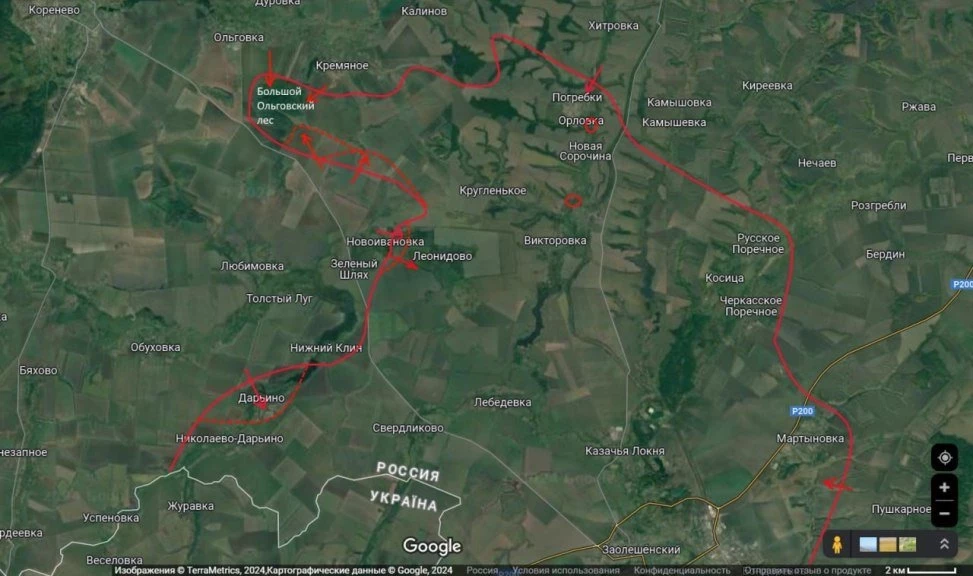 В качестве примера он приводит информацию, по которым армия России контролирует населенные пункты Орловка, Погребки и Новые и Старые Сорочины. Ранее аналитик уже писал, что по сути прорвавшиеся к деревням заняли круговую оборону и отрезаны от основных сил.