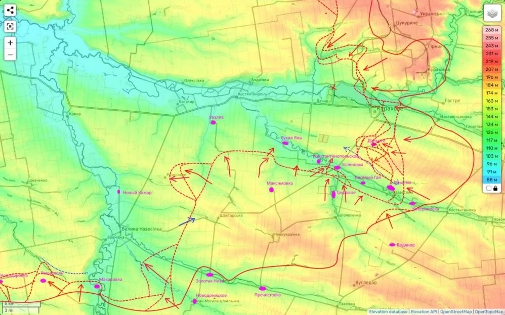 В южной части Кураховского направления фронт ВСУ продолжает сыпаться. Командование ВСУ в оцепенении не делает практически ничего, чтобы его спасти. А для этого им надо сейчас уже отводить свои части и довольно далеко от нынешней лини фронта.