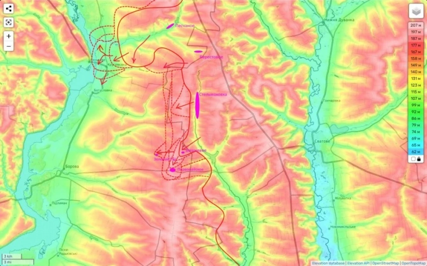 Это уже спуск с высот в долину реки Оскол. А еще это заход в тыл группировке противника удерживающего дорогу вдоль реки в районе н.п. Богуславка.