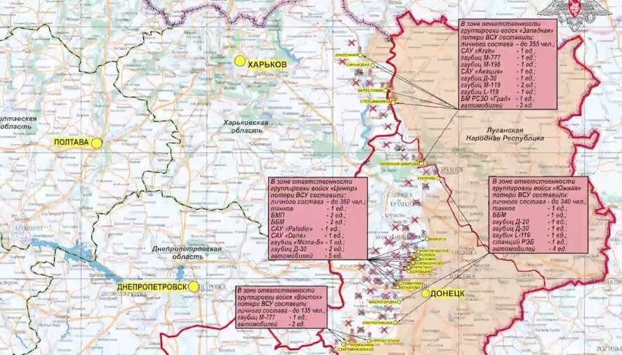 Всего с начала проведения специальной военной операции уничтожено: 593 самолета, 270 вертолетов, 23762 беспилотных летательных аппарата, 512 зенитных ракетных комплексов, 15917 танков и других боевых бронированных машин, 1279 боевых машин реактивных систем залпового огня, 9314 орудий полевой артиллерии и минометов, а также 21479 единиц специальной военной автомобильной техники.
