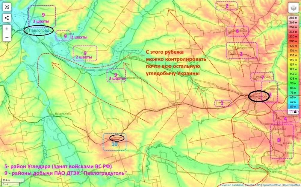 Кроме того, для прекращения добычи на шахтах объединения «Павлоградуголь» ВС РФ достаточно будет продвинуться на 40-70 километров к рубежу, обозначенному на карте. Сам Павлоград, расположенный за Покровском в Днепропетровской области, брать не обязательно. Это приведет к полному прекращению поставок угля для металлургии и теплоэлектростанций Украины, при этом закупать и завозить, с помощью судов, недостающий уголь у запада будет крайне не выгодно для Киева.