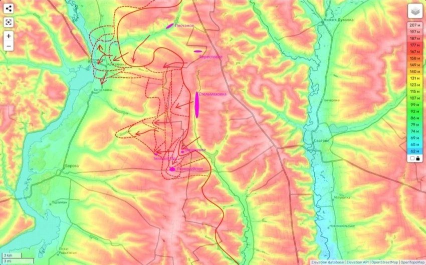 "Обратите внимание на тактику наступления здесь нашей армии. Она нестандартная. Обычно как происходит. Атака идет по холмам, заняв которые, противника заставляют отходить с низин. Здесь все с точностью до наоборот. Помните прорыв к Осколу. Он ведь тоже шел не по холмам, а по низине через н.п. Песчаное. Холмы вокруг брались под контроль уже потом", - пишет Подоляка.