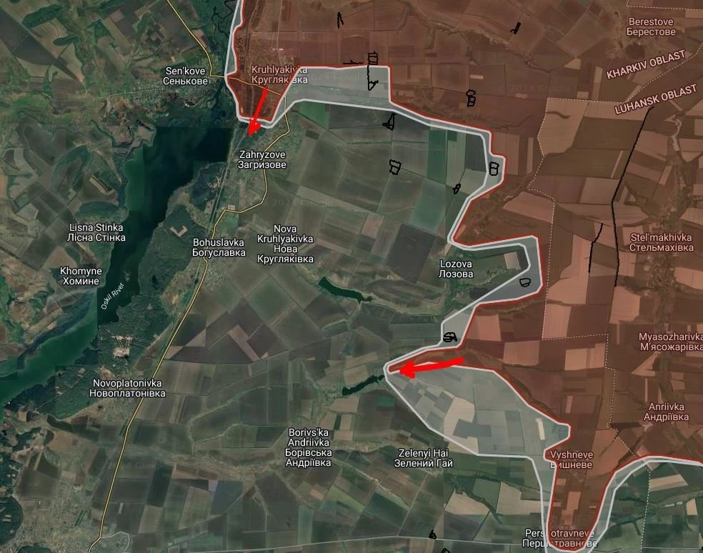 На Купянско-Лиманском направлении продолжаются позиционные бои на окраинах Двуречной, российские войска ведут штурмовые действия в направлении Загрызово. ВС РФ имеют тактические успехи севернее Зелёный Гай.