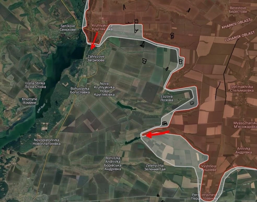 Южнее Пушкино российские войска продвинулись в направлении Украинки на участке шириной до 2.3 км на глубину до 1.35 км. Под контроль ВС РФ перешла Солнцевка, а также участок на западной окраине шириной до 1.95 км.
