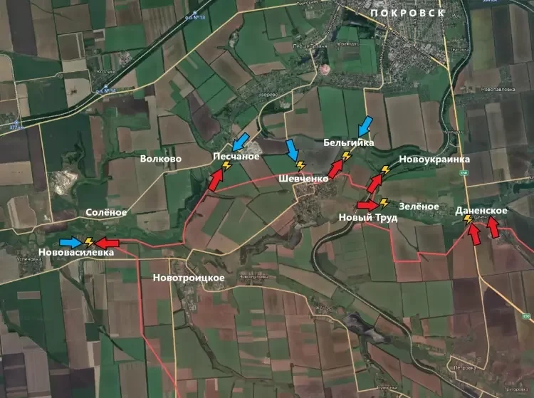 На Покровском направлении ВС России развивают успех с юго-запада, атакуя со стороны Даченского. Также продолжаются бои у Новотроицкого и южнее: ВС России наступают юго-западнее Покровска широким фронтом.