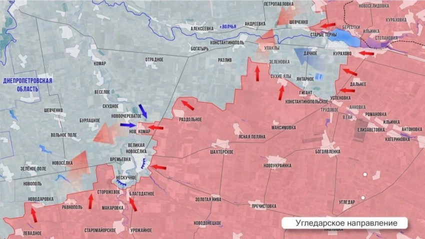 На Угледарском направлении Великая Новоселка, судя по всему, оказалась в реальном полуокружении. ВС РФ добрались до дороги от Времевки на Гуляйполе и закрепились за ней, лишив Великую Новоселку последней асфальтированной дороги. Остается еще несколько грунтовых дорог северо-западнее, нашим бойцам осталось пройти около 1 км на север, чтобы блокировать и их. ВСУ активизировали контратаки в Новом Комаре, стоит ожидать их и на дороге на Гуляйполе. В районе Разлива ВС РФ развивают наступление в сторону Константинополя. В Курахово наши силы постепенно окружают гарнизон ВСУ, закрепившейся в промзоне на западе города. Все ближе решающий момент, когда на одном из участков армия России перережет дорогу на Запорожье и закроет котел, противник отчаянно сопротивляется.
