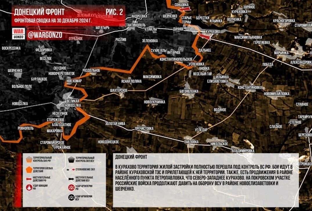Донецкий фронт. В Курахово территория жилой застройки полностью перешла под контроль ВС РФ. Бои идут в районе Кураховской ТЭС и прилегающей к ней территории. Также, есть продвижения в районе населённого пункта Петропавловка, что северо-западнее Курахово. На Покровском участке российские войска продолжают давить на оборону ВСУ в районе Новоелизаветовки и Шевченко.