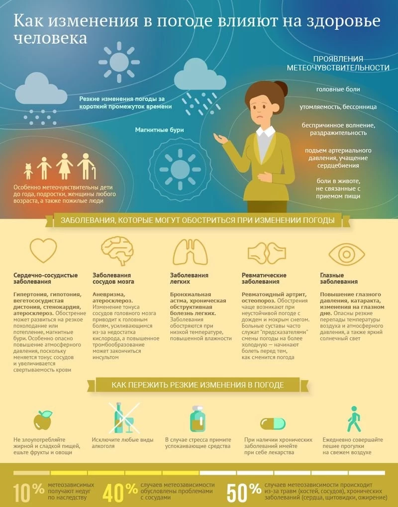 «Кроме того, нужно обязательно продолжать приём лекарственных препаратов, назначенных ранее лечащим врачом, если имеются хронические заболевания. А решающая борьба с метеозависимостью принадлежит сну! Поэтому, обязательно нужно высыпаться, не перенапрягаться, не сидеть долго за компьютером и не выполнять сильную умственную нагрузку. Либо делать перерывы», - поведала Суровцева в интервью изданию "Добро.Журнал".