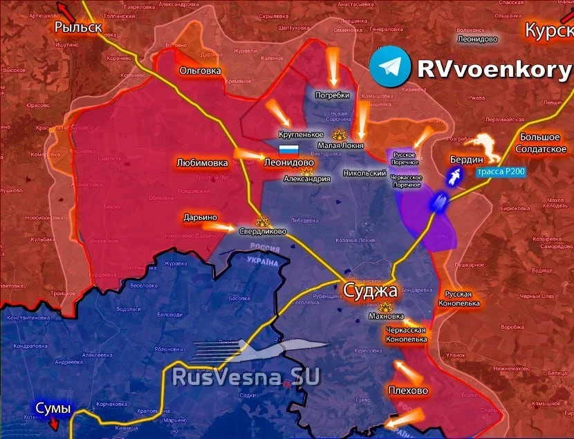 Вчерашняя неудачная попытка наступления ВСУ пока не получила никакого продолжения, хотя в районе Суджи, откуда ВСУ выдвигались вчера, есть движение вражеских сил. По данным американского Института изучения войны (которые далеко не всегда отражают реальность), украинские военные зашли в южную часть Бердина и дошли до дороги, которая соединяет его с Новосотницким. По подсчётам аналитиков, ВСУ смогли пройти примерно на 2,7 км вглубь территории России. Однако судя по данным с мест, закрепиться там они не смогли.