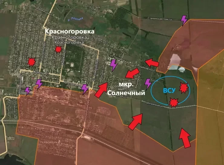 Российские войска активизировали наступательные действия в районе Красногоровки, применяя комплексную тактику окружения противника, что привело к значительным изменениям на линии фронта. По информации, полученной от военных аналитиков и местных источников, 5-я бригада ВС РФ осуществила решительные атаки с востока и юга Красногоровки, где ранее украинская оборона уже испытывала серьезное давление.
