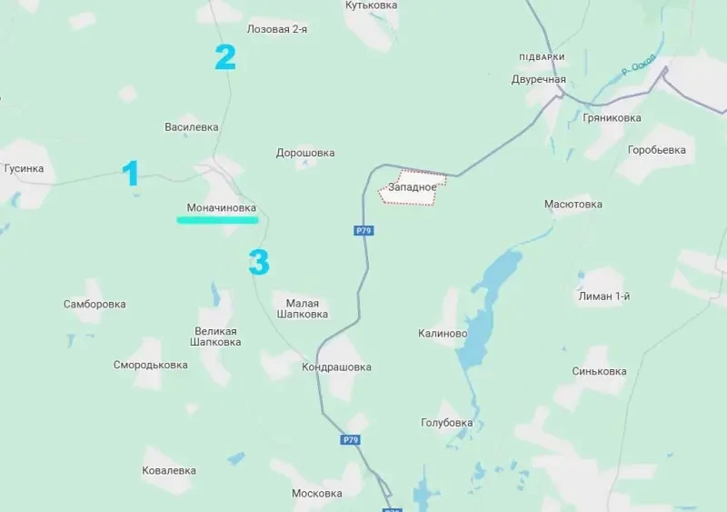 При дальнейшем успехе ВС РФ может появиться возможность дойти до села Моначиновка, а оно находится на «слиянии» сразу двух путей снабжения противника. Одна дорога идёт со стороны Печенежского водохранилища, другая - от Великого Бурлука на севере Харьковской области. За Моначиновкой дороги переходят в одну, ведущую в Купянск с северо-запада. Они помечены последовательно цифрами на фрагменте карты: