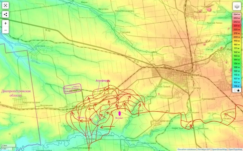 Ещё недавно он проводил контратаки большими силами (425 штурмовой полк ВСУ «Скала»), а сегодня уже только пытается задерживать наше наступление. Мы быстро распространяем своё присутствие южнее села (здесь мы уже примерно в 4 км от границы с Днепропетровской областью), а также начали бои за ЖД станцию.