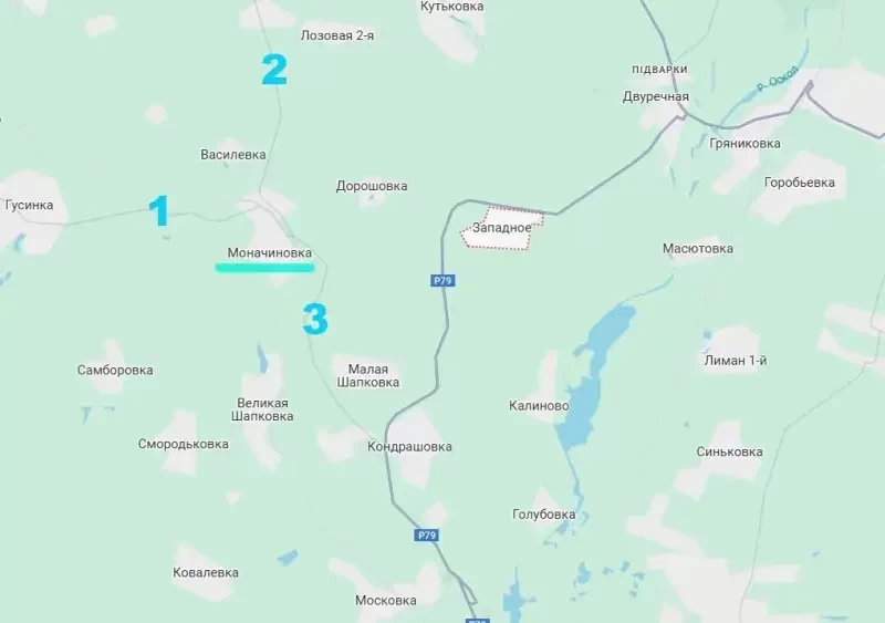 При дальнейшем успехе ВС РФ может появиться возможность дойти до села Моначиновка, а оно находится на «слиянии» сразу двух путей снабжения противника. Одна дорога идёт со стороны Печенежского водохранилища, другая - от Великого Бурлука на севере Харьковской области. За Моначиновкой дороги переходят в одну, ведущую в Купянск с северо-запада. Они помечены последовательно цифрами на фрагменте карты: