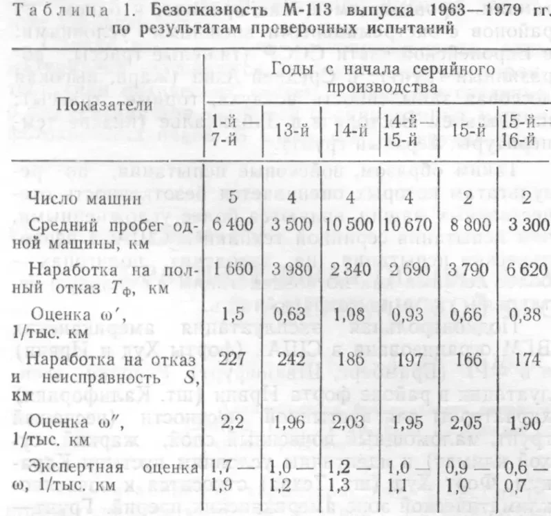 Общая оценка безотказности М-113 определена на уровне ω≈1,2 1/тыс. км, состав отказов (примерно равное количество отказов силовой установки, ходовой части и электрооборудования) свидетельствует об обработанности конструкции. Следует отметить, что подконтрольная эксплуатация бронетранспортеров в США проводилась в более легких условиях, чем отечественных БМП-2, большинство из которых эксплуатируется в условиях абразивных грунтов и разбитых танковых трасс Прикарпатья.