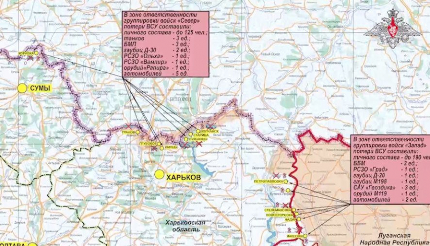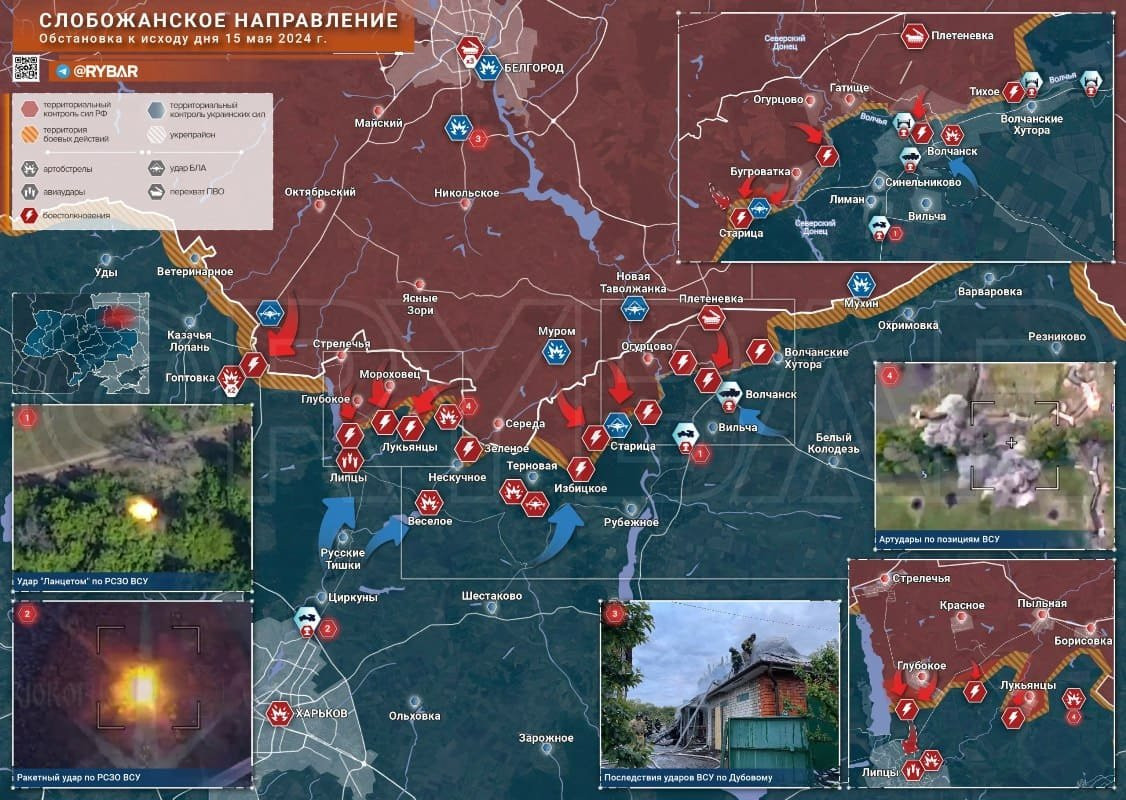 На Харьковском участке идут интенсивные бои на двух направлениях. В Волчанске ситуация постоянно меняется, с обеих сторон много неподтвержденной информации. В целом, судя по всему, наши передовые части смогли форсировать реку Волчья и готовят позиции для потенциального охвата, ВСУ частично отступают. Практически вся северная часть города, вероятнее всего, под контролем нашей армии, включая здание администрации. Наши поразили автомобильный мост, последний подходящий для тяжелой техники. В районе Липцов ВС РФ заняли господствующую высоту к северу от села и усиливают давление. Авиация и артиллерия очень мощно работают по приграничью Сумской обл.