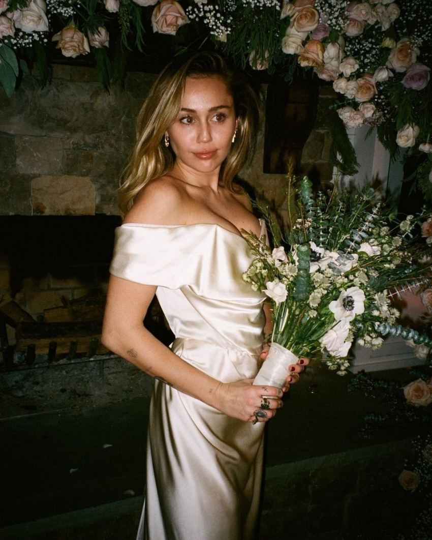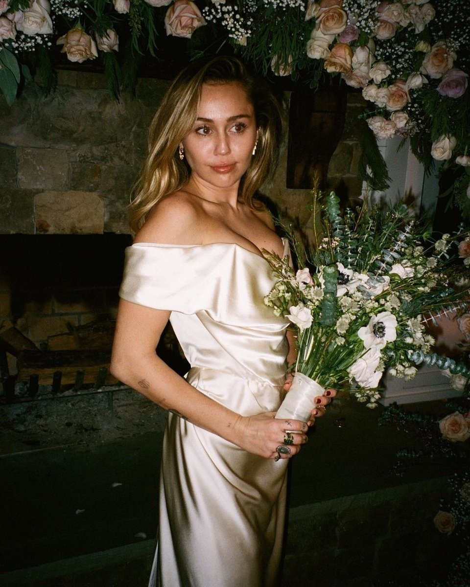Несмотря на скрытность церемонии, свадебный наряд Майли Сайрус был одним из самых элегантных. Созданный Вивье Вествуд, этот наряд из шелка поражает своей простотой и изяществом.