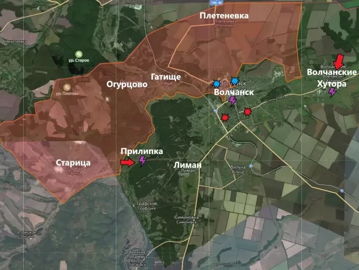 На Харьковском фронте освобождено село Старица западнее Волчанска. Вкупе с Зыбино на востоке это создает условия для охвата города. Внутри наши вышли на правый берег р.Волчья, которая делит город на северную и южную части. Ночью ВС РФ продвинулись по восточному охвату Липцов, заняв позиции за речкой Липец. Идут тяжёлые бои.