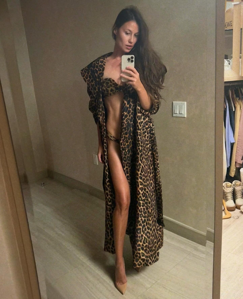 Анна Кастерова поделилась снимком в пляжном образе с леопардовым принтом. Жена хоккеиста Евгения Малкина сделала селфи в зеркало, позируя в длинной накидке и бикини, дополнив свой образ бежевыми лодочками. Подпись к фото гласила: