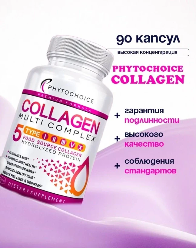 PhytoChoice Multi Collagen Complex — универсальный бьюти-боеприпас для кожи, волос, ногтей и суставов. В одной капсуле — сразу пять типов коллагена (I, II, III, V, X) из премиального сырья: бычий, морской, куриный и яичный. Такой состав поддерживает упругость кожи, эластичность связок и плотность костей. Удобная форма капсул, отсутствие глютена, ГМО и молочных компонентов делают добавку безопасной и доступной даже для аллергиков. Это комплекс из категории must-have для тех, кто решил обновить себя изнутри.