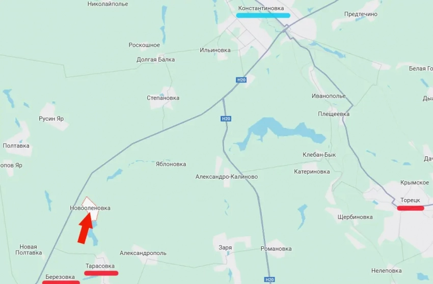 Поступает информация о продвижении наших войск на Константиновском направлении. После освобождения сёл Тарасовка и Берёзовка российские войска успешно продвинулись вдоль реки Бычок, которая на данном участке протекает восточнее автомобильной дороги Т0504 Покровск-Константиновка.