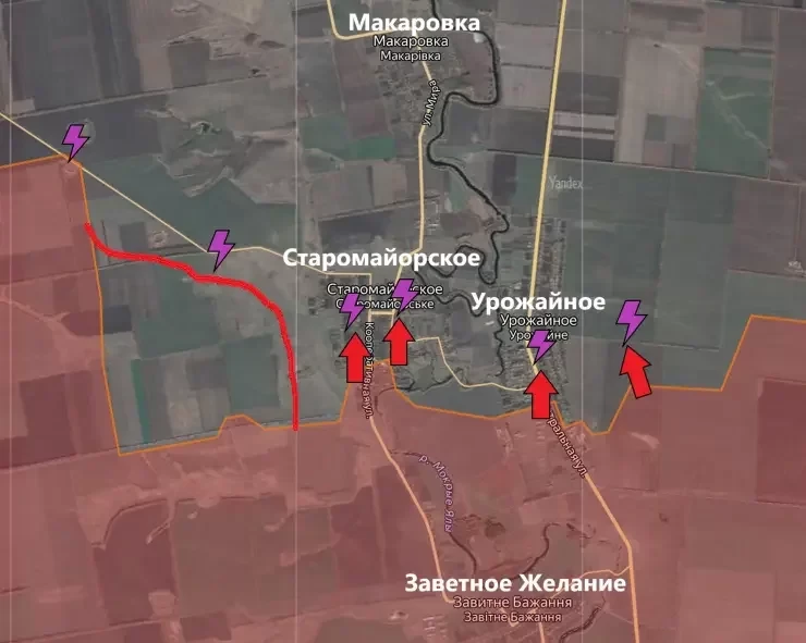 На Времьевском направлении российские силы продвинулись в Старомайорском и Урожайном, а в Большой Новоселке воздушно-космические силы РФ повредили мост.