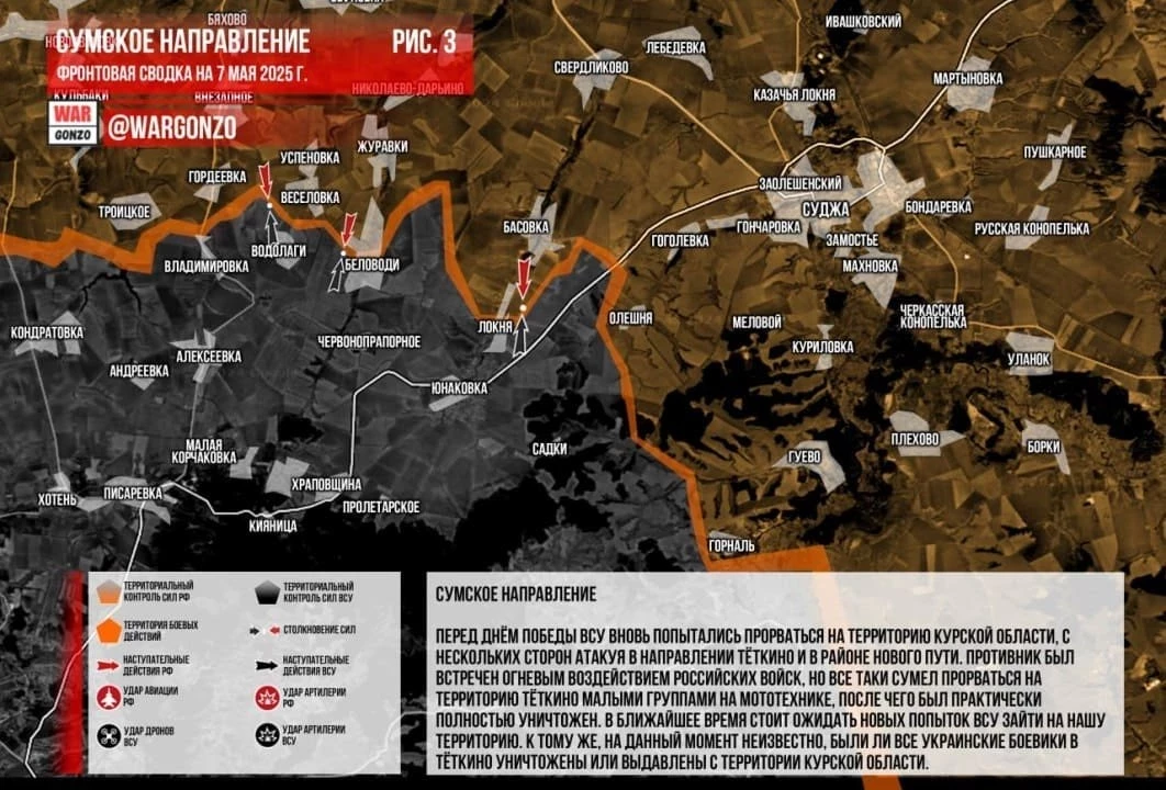 «Снова противник атакует в направлении наших границ, Теткино и Новый Путь приграничные населенные пункты, причем расстояние между ними 15 км по прямой. Наступая сразу на двух рубежах, враг пытается растянуть силы и стремится на одном из участков прорвать оборону. Причем вчера были заняты противником две улицы в Теткино, наша авиация активно работает ФАБами по закрепившимся группам ВСУ. Также есть информация и о встречных боях между группами противника. Но сути того, что это происходит на наших территориях, не меняет. Ситуация сложная, но все наши подразделения максимально нацелены на выбивание вражеских войск», - пояснили авторы канала.
