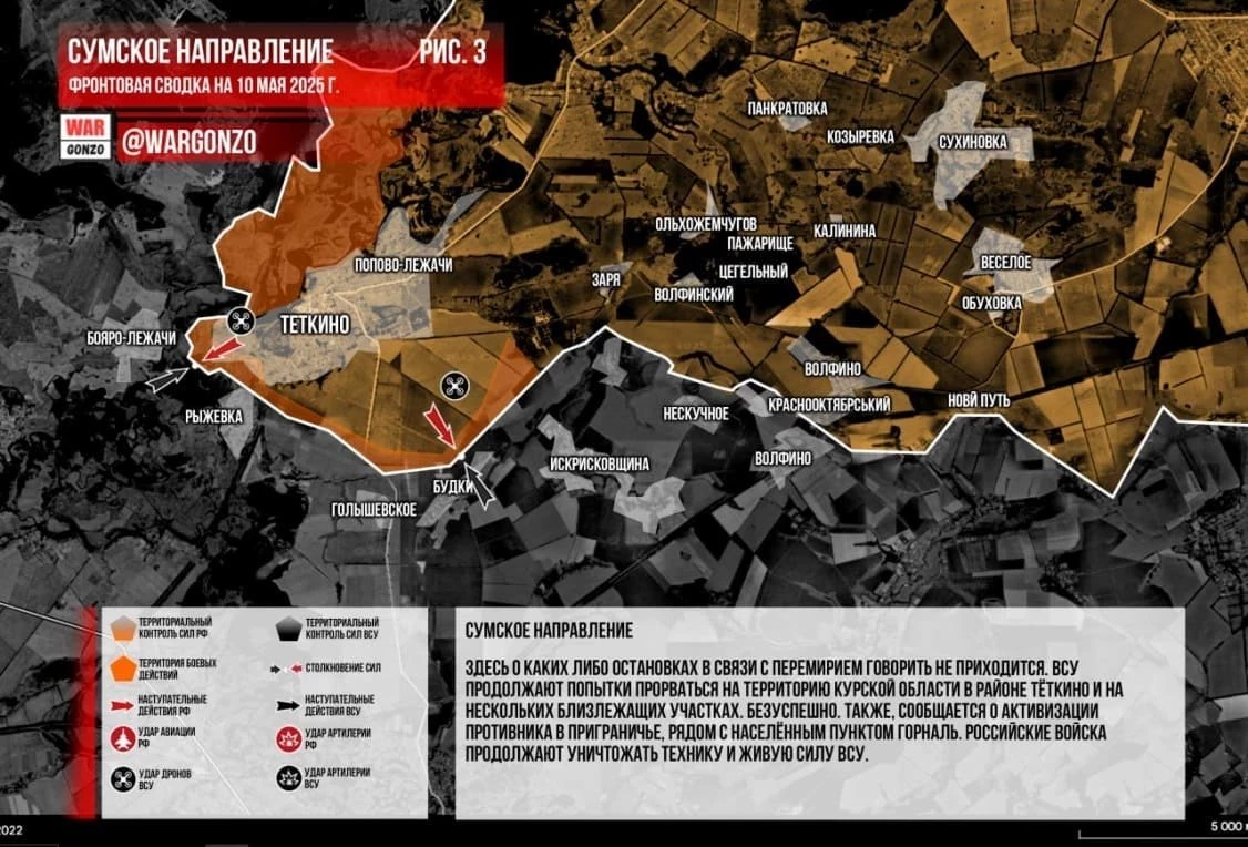 В Курской области ВСУ ведут ползучее наступление на Тёткино: карта боевых действий по состоянию на 10.05.2025