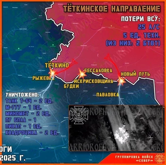 Непосредственно в окрестностях Тёткино наносится комплексное огневое поражение по всем возможным укрытиям противника. Враг несет существенные потери в живой силе, в том числе из-за отсутствия эвакуации раненых.