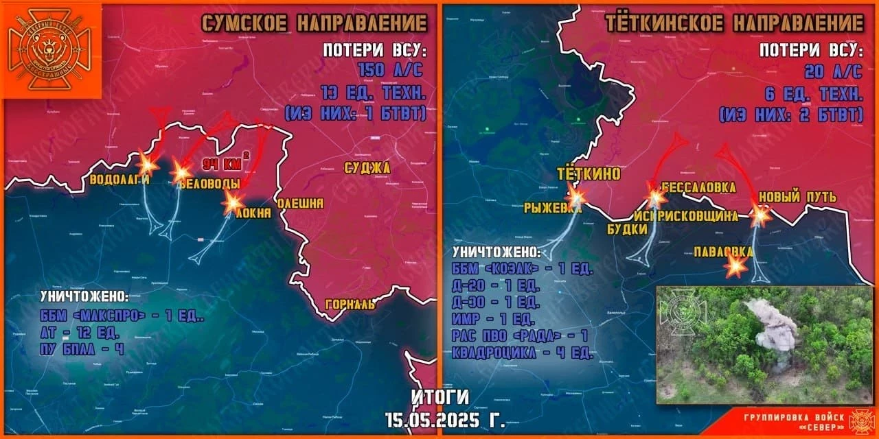 «Подразделения ВДВ „северян“, сломив упорное сопротивление противника, продвинулись в Беловодах, Локне и окрестностях населенных пунктов. Некрологи показывают, что враг несет потери также в соседней Яблоновке, откуда на усиление в Беловоды должны были быть переброшены пограничники 5-го ПОГО (Сумской погранотряд), группы которых уничтожили наши артиллеристы и операторы БПЛА», - отметил источник.