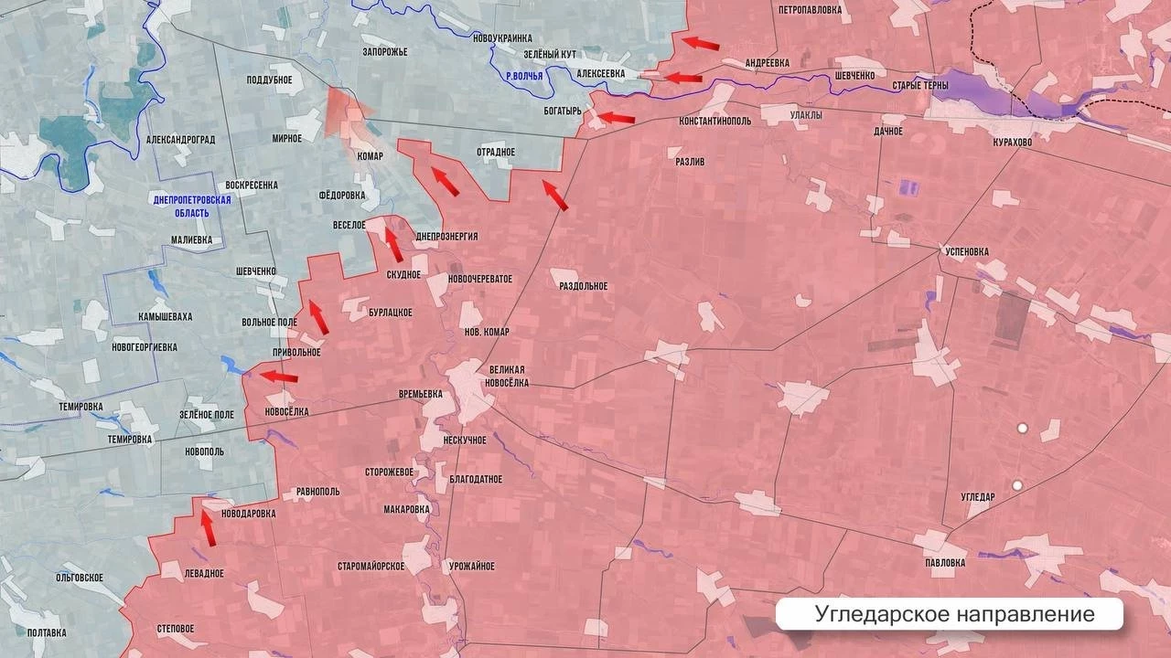 На Угледарском направлении ВС РФ наращивают давление на рубежи противника к западу от Великой Новосёлки. МО РФ сообщило об освобождении Вольного Поля. Успехи есть северо-восточнее Шевченко и к северу от Бурлацкого. ВС РФ зачищают лесопосадки южнее Отрадного и постепенно приближаются к его окраинам. В Богатыре бои идут в центре села.