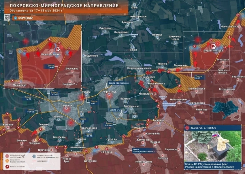 Западнее Торецка российские подразделения перерезали трассу на Константиновку в районе Новооленовки и продвигаются к Полтавке. По оперативным данным, наши войска, продвигаясь широким фронтом, вышли к окраинам Яблоновки. Восточнее наши бойцы ведут ожесточенные бои в большом кармане, пытаясь заблокировать ВСУ по рубежу Александрополь-Заря-Романовка. Для этого наши штурмуют Романовку и пробиваются к Заре. Этот клин опасен для ВСУ тем, что он угрожает Покровску с востока и формирует охват района Александро-Калиново -Клебан-Бык в предполье Константиновки. Восточнее Торецка идут бои в посёлке Дылеевка.