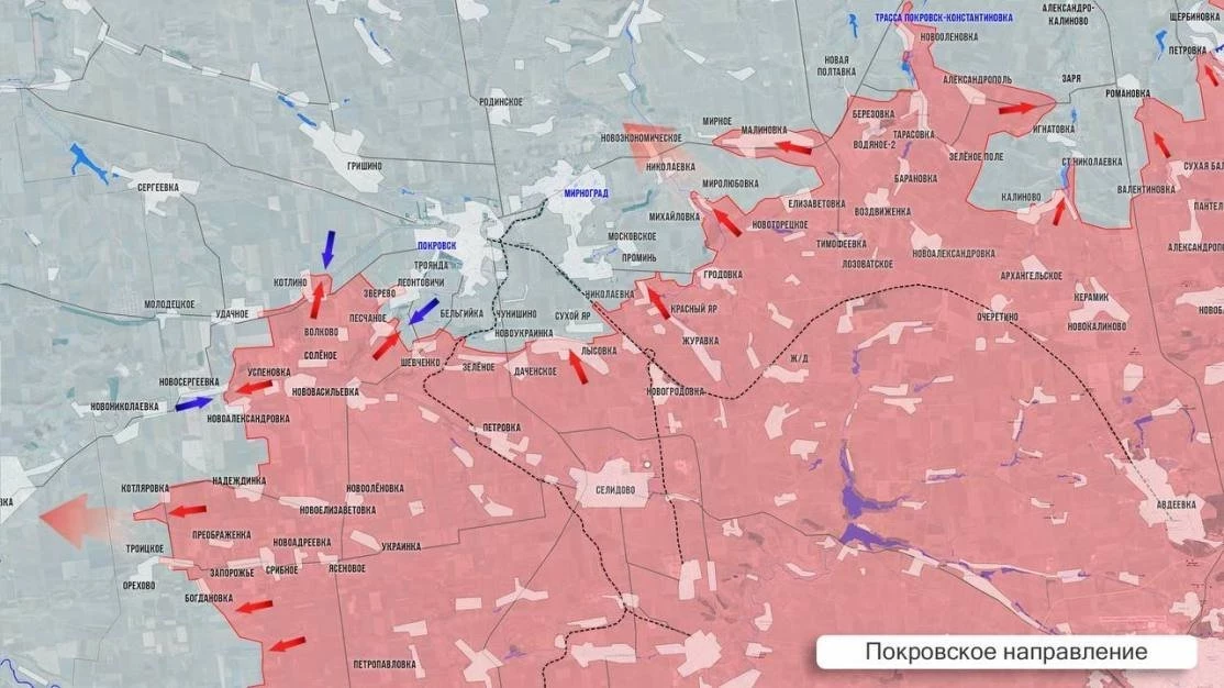 На Покровском направлении местами нелётная погода - дожди и туманы. ВС РФ пользуются снижением активности дронов ВСУ для продвижения по всему участку фронта от Богдановки до Новониколаевки и Новосергеевки. В районе Удачного ВС РФ стараются обойти позиции врага по лесополкам южнее и севернее. В Котлино наши штурмовики продвигаются в районе ферм. Наши теснят ВСУ в Зверево и в районе Леонтовичей, где противник выстраивает оборону вокруг двух терриконов. Правее идут упорнейшие бои за опорники южнее Чунишино и Новоукраинки. В районе Малиновки наши части вышли к окраинам Шевченко Первого.