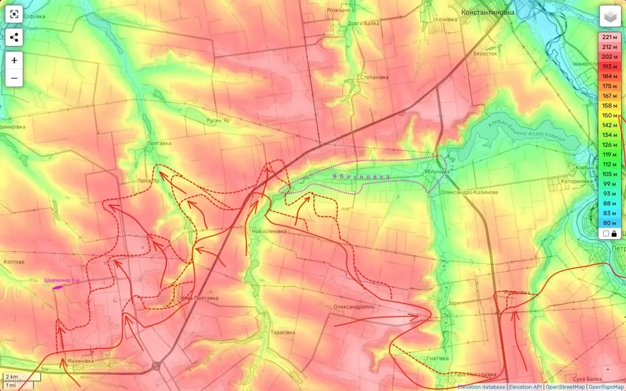 Четыре дня назад российские подразделения штурмовали Новую Полтавку, а уже вчера вышли на южную окраину Полтавки, приблизились к Попову Яру и с двух направлений подошли к селу Шевченко 1-е. Параллельно ВС РФ продвигаются по трассе Покровск-Константиновка, обходя Яблуновку с севера и приближаясь к Степановке.